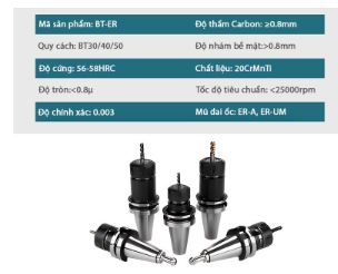 Các loại collet sử dụng với bầu kẹp dao phay ngón BT30 là: ER16, ER32. Các chi tiết kết cấu của bầu kẹp được gia công mài nhẵn xử lý nhiệt luyện bề mặt nên đảm bảo độ ổn định cũng như tính chính xác khi gia công trên máy phay CNC. Tùy từng mục đích gia công mà quý khách hàng cần chọn lựa chiều dài của phần gá dao tương ứng.