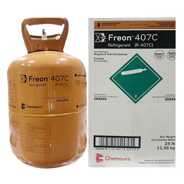 Gas lạnh R407C Chemours Freon (hay còn gọi là môi chất lạnh R-407C hoặc Gas R407C DuPont) là hỗn hợp gas không gây hại tầng ozone (HFC), được thiết kế đặc biệt để thay thế cho R22 trong các hệ thống điều hòa không khí và máy làm lạnh nước (Chiller). Với trọng lượng tiêu chuẩn 11.35kg, sản phẩm từ thương hiệu Chemours (Mỹ) đảm bảo hiệu suất giải nhiệt cao và độ ổn định vượt trội cho các thiết bị công nghiệp đời mới.